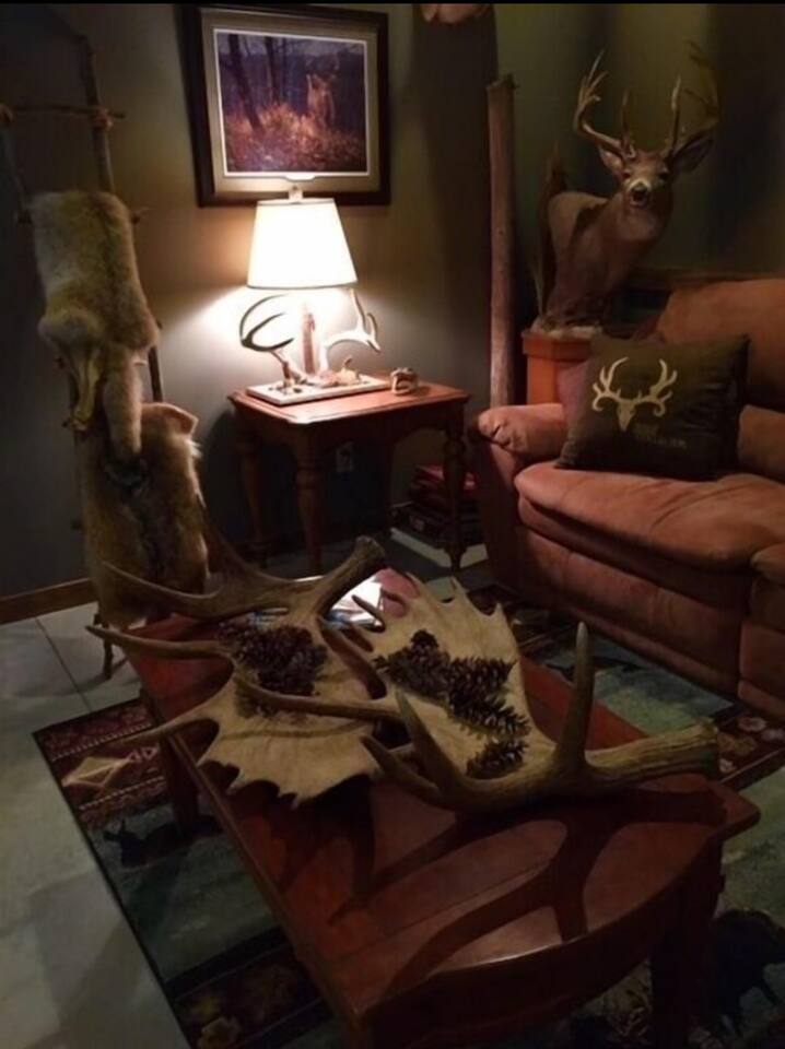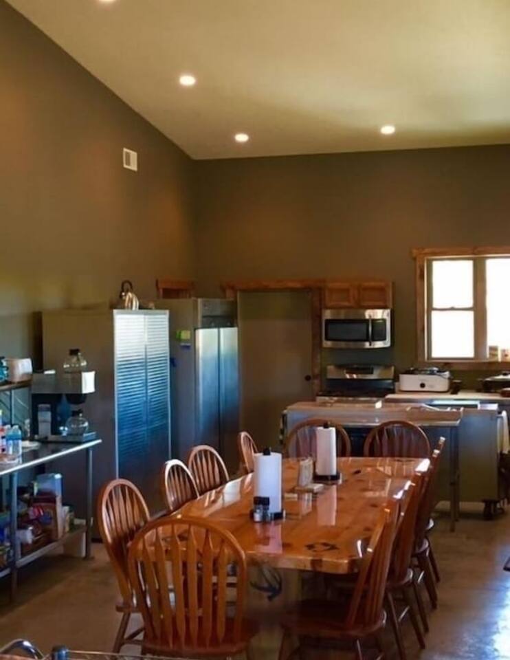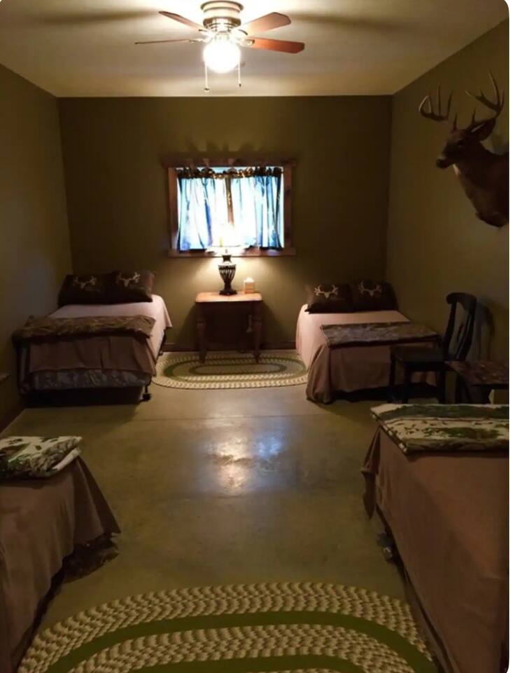 Welcome to Ghost Hollow Lodge! This cozy retreat offers a commercial-style kitchen, complete with a floor-based roll-top refrigerator, utensils, and tools for any meal. The spacious kitchen table seats 10, providing a perfect setting for gatherings. Choose between our double-pot Bunn coffee maker or Keurig for your caffeine fix. Enjoy 4 bedrooms, each equipped with a queen bed and 4 twin beds for a restful night's sleep. Refresh in our bathrooms featuring showers, toilets, hair dryers, body soap, and shampoo. The living room showcases impressive taxidermy, a big screen TV, and ample seating on 2 couches and a sectional. In the laundry room, discover clean towels, washcloths, and all your cleaning essentials. With two washers and two dryers, we ensure convenience during your stay. We look forward to making your Ghost Hollow Lodge experience memorable!